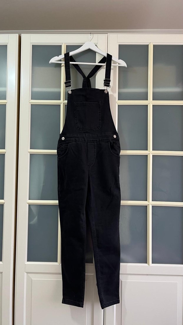 Siyah denim kumaştan, ayarlanabilir tokalı askılı, regular fit ve yüksek yakalı günlük rahat tulum.