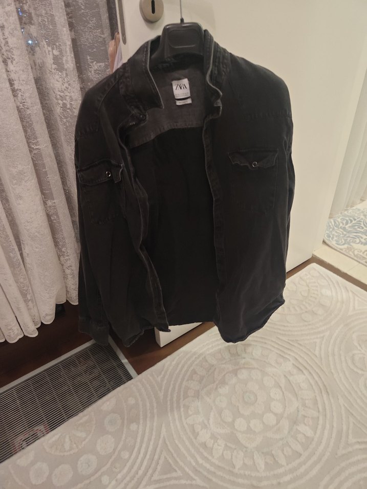 Siyah denim kumaştan, düğmeli, uzun kollu ve bol kesim erkek ceket. Notched lapel yaka ve midi boyda, günlük kullanıma uygun.