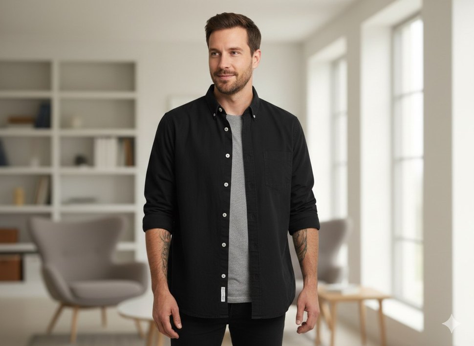 Siyah denim kumaştan, uzun kollu, regular fit erkek gömlek. Gündelik kullanıma uygun, sade ve zahmetsiz şıklık sunar.