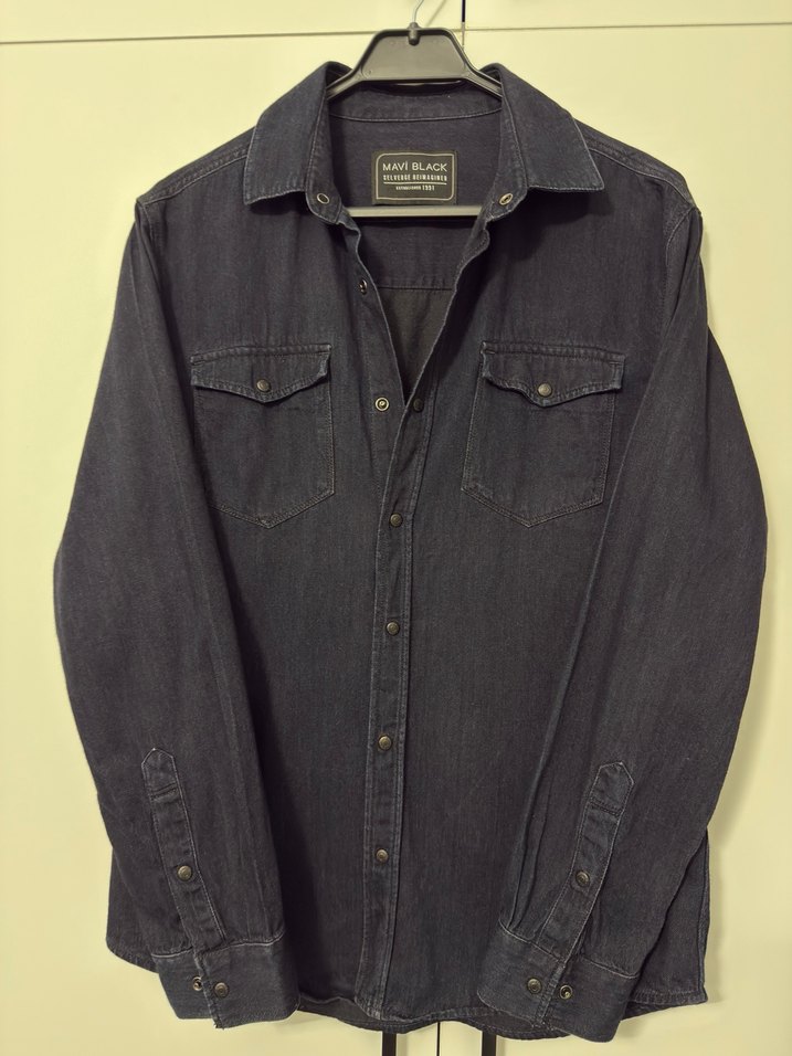 Siyah denim kumaştan yapılmış erkek gömleği, çıtçıtlı ön kapama ve cepli tasarımla sade bir görünüm sunar. Uzun kollu, normal kesim ve günlük kullanıma uygundur.