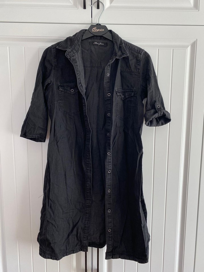 Siyah denim kumaştan, düğmeli ve yakalı midi boy rahat kesim elbisedir. Günlük kullanıma uygundur.