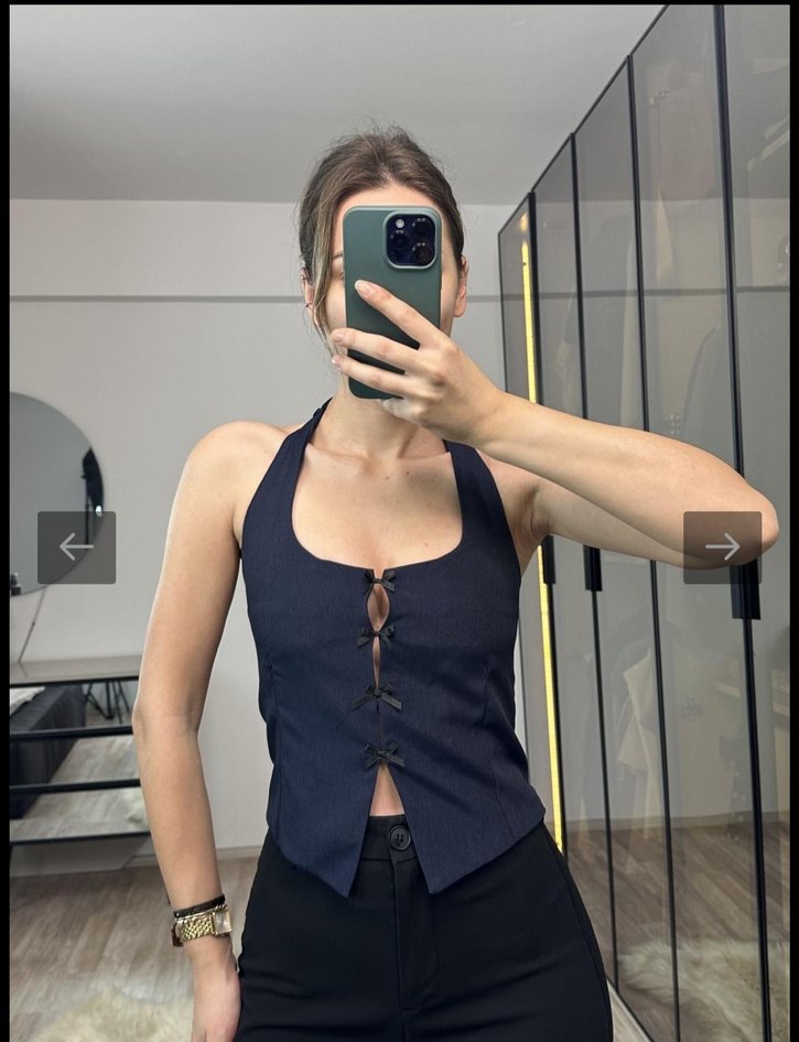 Siyah denimden, halter yaka ve vücuda oturan bustiyer. Önde bağcıklı detaylar, kolsuz ve midi boyda, trend sokak stili için uygundur. Valeur marka