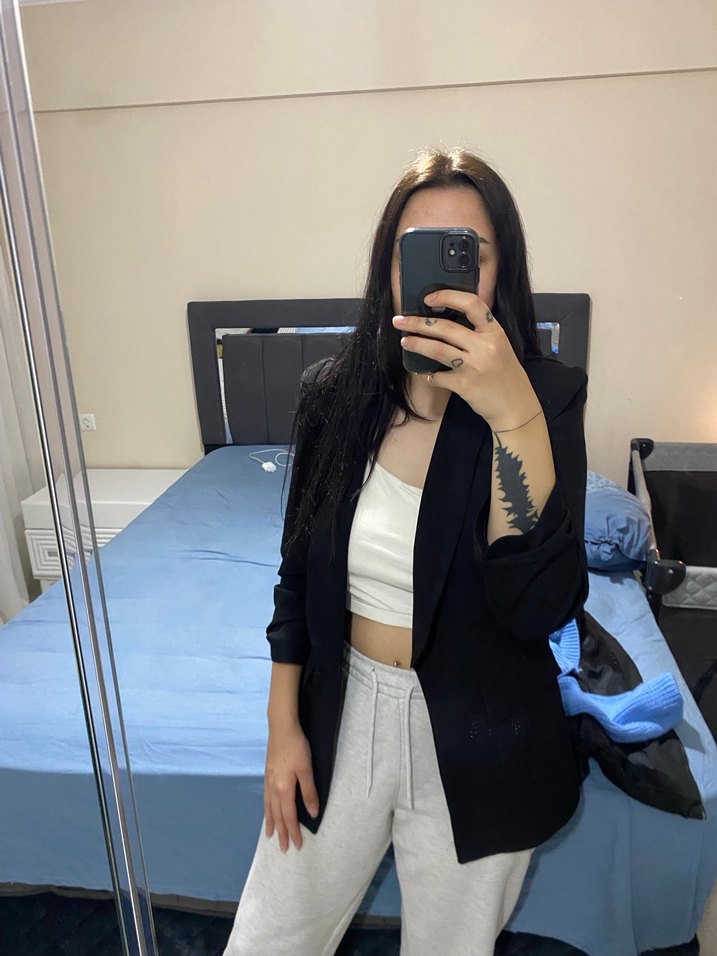 Siyah denim kumaştan, kesimi vücuda oturan, yakası kesik ve uzun kollu blazer ceket. Ofis için şık, rahat ve modern bir görünüm sağlar.