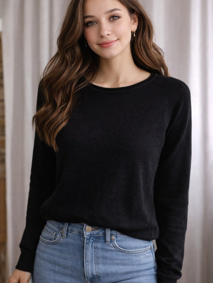 Siyah renk, yuvarlak yaka ve uzun kollu denim kadın sweatshirt. Rahat kesimi ve normal boyu günlük sokak stili için uygun, desensiz ve şık görünümlü.
