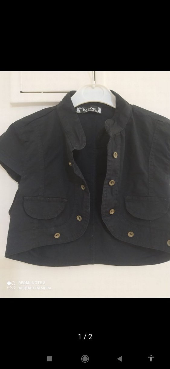 siyah denim bolero, notched lapel yaka ve düğmeli kapama ile. Kısa kollu, fitted kesim ve ön cepler bulunur.