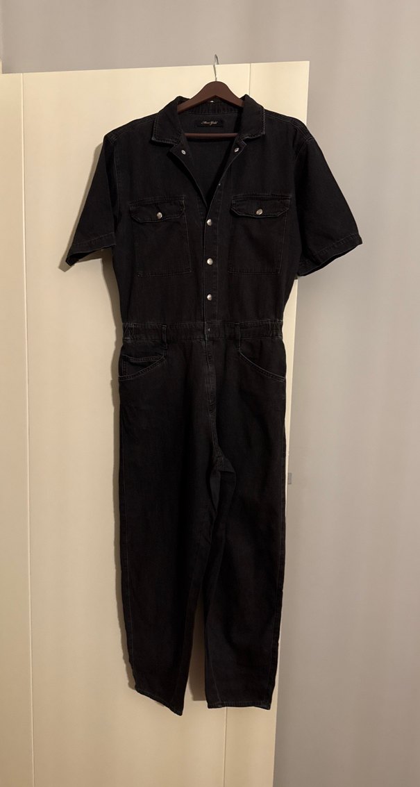 Siyah denim kumaştan, kısa kollu, düğmeli ve yakalı midi uzunlukta bol kesim tulum. Rahat ve günlük kullanım için uygun.birlere giyildi hiçbir ksuuru yoktur . Ürün gemiş kalıptır