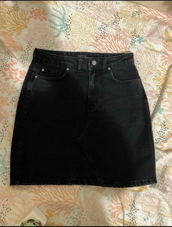 Siyah denim kumaştan, midi boy ve vücuda oturan kesime sahip etek. Günlük kullanıma uygun, rahat ve şık bir sokak stili parçası.