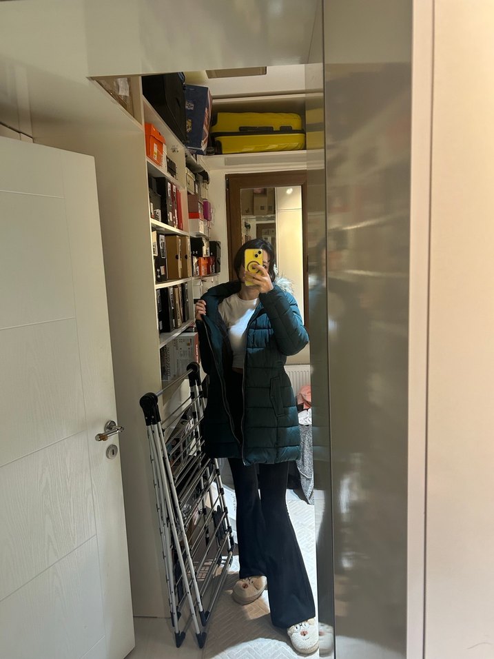 Yüksek yakalı, şişme uzun kollu, siyah denimden yapılmış, trend sokak stili için uygun, normal uzunlukta ve vücuda oturan kadın kışlık mont.