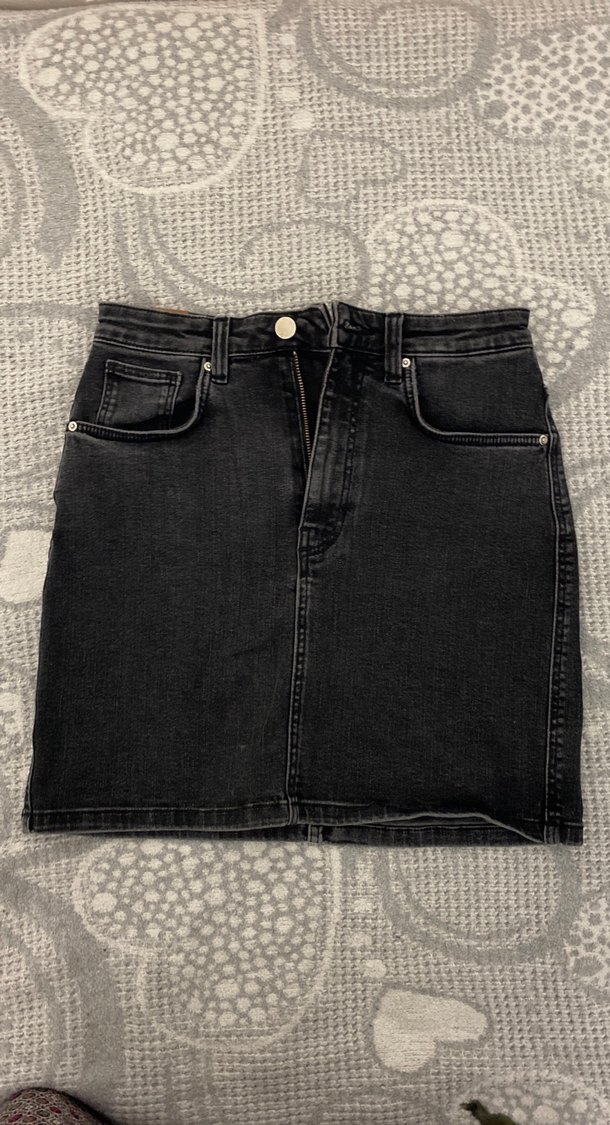 Klasik beş cepli, siyah denim mini etek. Günlük kullanıma uygun, rahat ve şık sokak stili sunar.