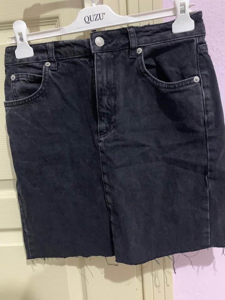 QUZU markalı, siyah, fitted kesim denim mini etek, normal boyda ve bitmemiş kenar detaylıdır, gündelik rahat ve şık bir tarz sunar.