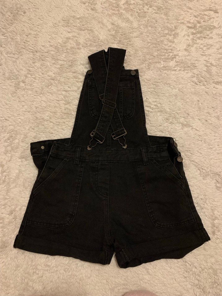 Siyah denimden yapılmış, tokalı askılara ve halter yaka tasarımına sahip, günlük kullanım için uygun mini kısa tulum. Rahat ve desensiz. 34 xs beden