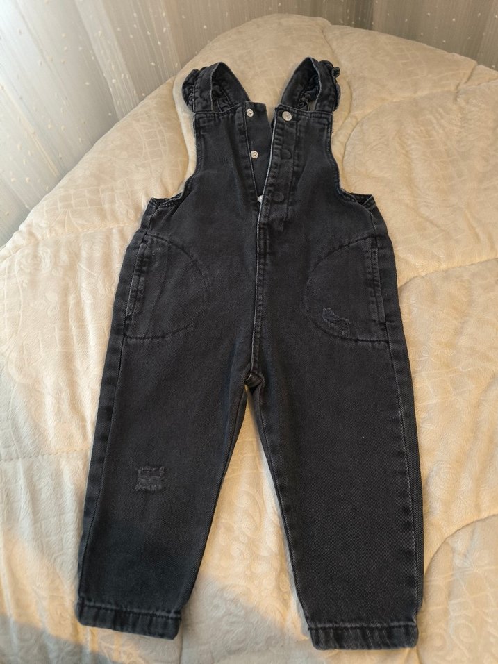 Siyah denim salopet, bol kesim ve tokalı askılarla. Sokak tarzı, desensiz sade tasarım.