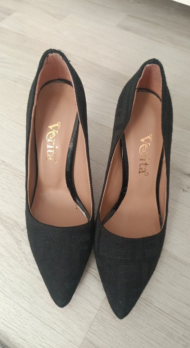 Siyah denim stiletto topuklu, koyu renk ve desensiz. Velcro kapamalı, Verita markalı, günlük kullanıma uygun bohem tarzda kadın ayakkabı.