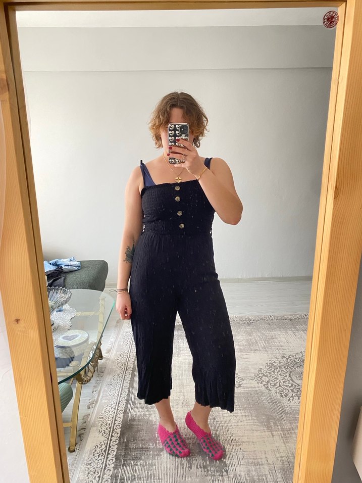 Siyah denim tulum, düğmeli ve straplez yakalıdır. Rahat ve bol kesimiyle günlük kullanıma uygundur. Siyah tulum.