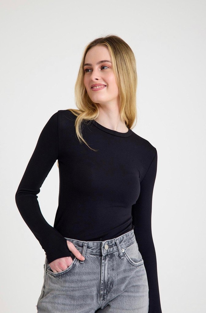 Bu fitted siyah denim bluz, uzun kollu ve yuvarlak yaka detaylarına sahiptir. Normcore tarzıyla günlük kullanıma uygun, zahmetsiz şıklık sunar.