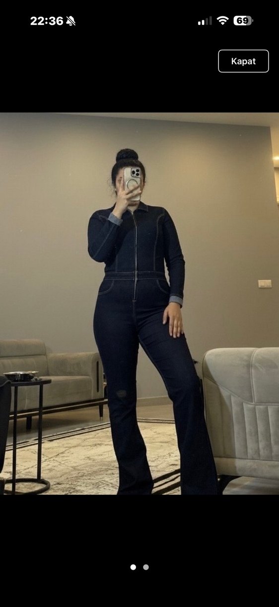Siyah denim kumaştan, uzun kollu ve yüksek yakalı, vücuda oturan kadın tulumu. Midi boyu ve sade tasarımıyla rahat ve şık bir günlük stil sunar.