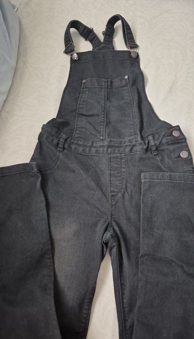 Siyah denim kumaştan, normal boy uzunlukta, tokalı askılı, bisiklet yaka ve desen içermeyen salopet. Günlük kullanım için uygundur.