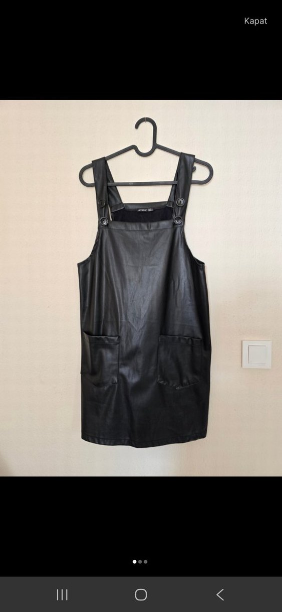 Siyah deri, askılı ve tokalı kısa elbise. Straplez yaka, midi boy ve ön ceplerle gotik, grunge punk tarzda. S beden ama ben M-L arası giydim