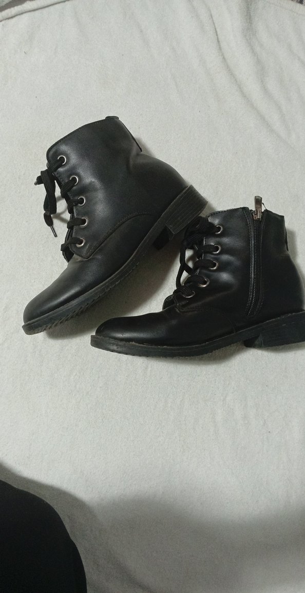 Siyah deri, blok topuklu, bağcıklı ve yan fermuarlı botlar. Günlük kullanım için grunge punk tarzına uygun, desensiz ve şık.