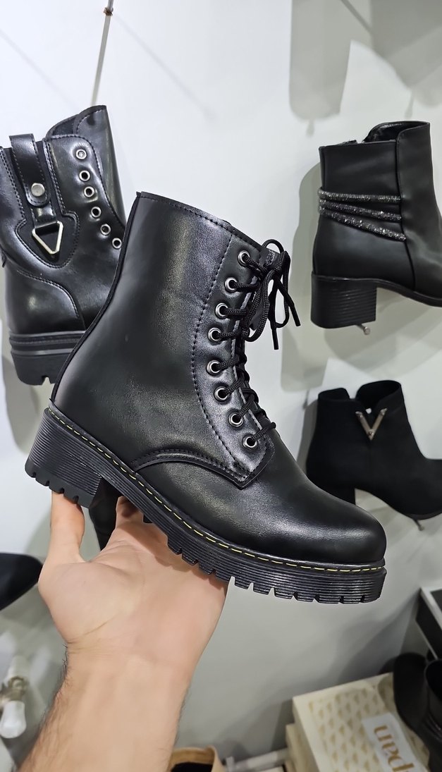 Siyah deri bağcıklı, blok topuklu goth botlar, kayışlı detaylarla rock punk havası katıyor. Günlük kullanıma uygun.