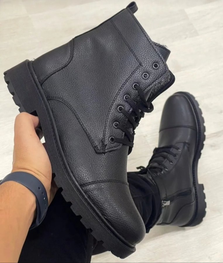 Siyah deri, bağcıklı erkek botları, sokak giyimine uygun. Koyu ve desensiz yapısıyla trend günlük tarzlar için uygun.