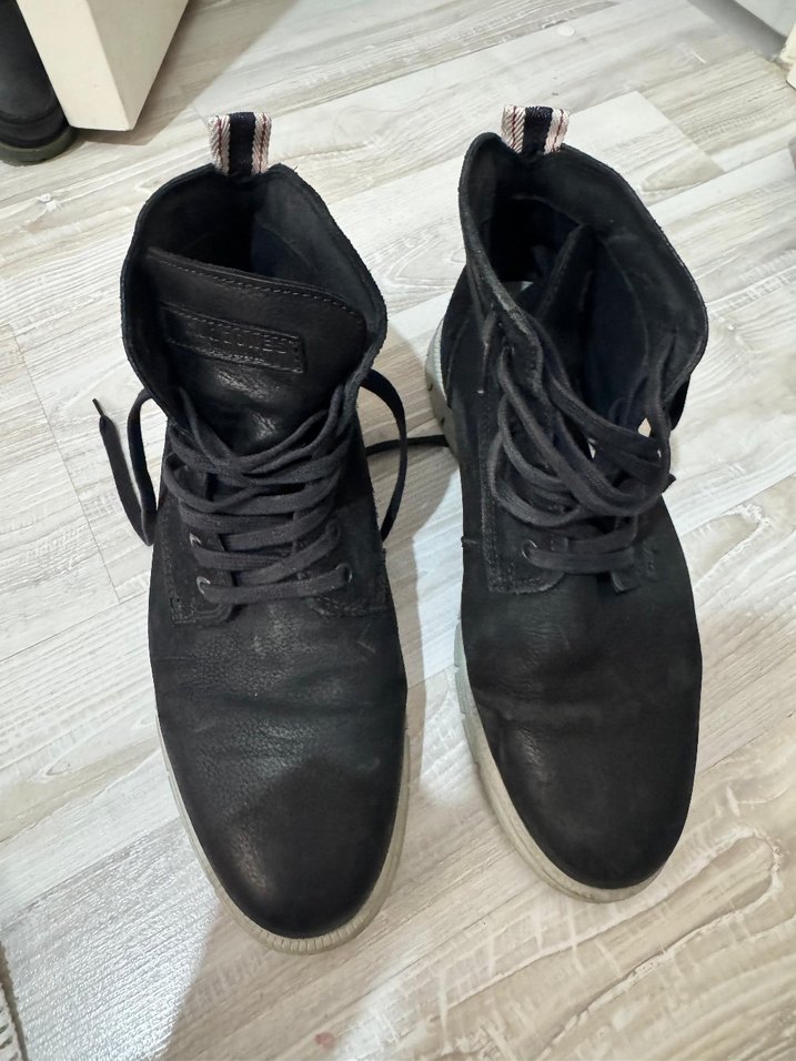 Siyah deri bağcıklı erkek bot, koyu tonlu ve sokak stili ile günlük kullanıma uygun.