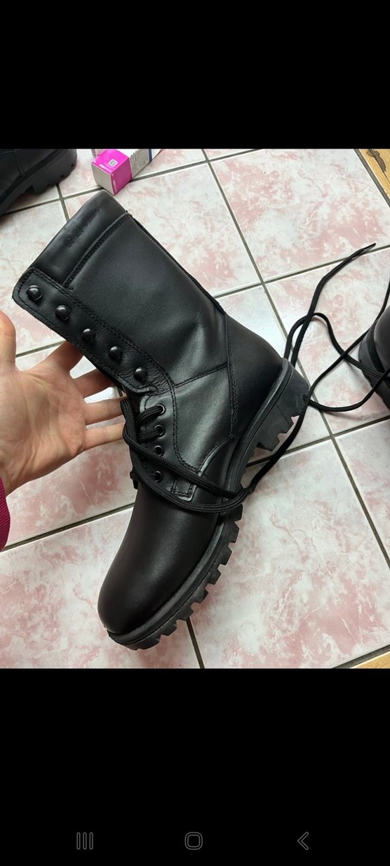 Siyah deri, bağcıklı erkek bot. Goth ve grunge punk tarzında, günlük kullanıma uygun koyu renkte, desensiz tasarım.