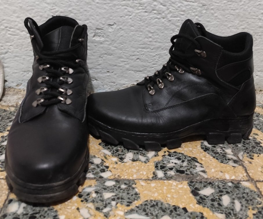 Siyah deri bağcıklı erkek botları, kalın tabanlı ve desen içermeyen koyu renkte. Günlük kullanım için uygun, grunge punk tarzında. 2 defa giyildi