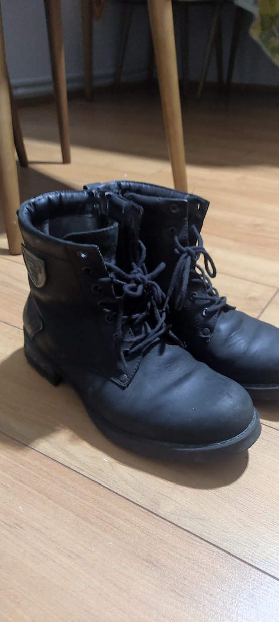 Siyah deri, bağcıklı ve tokalı erkek botları. Gotik tarzda, rock punk havası ve günlük kullanım için uygun. Desensiz ve dayanıklı.