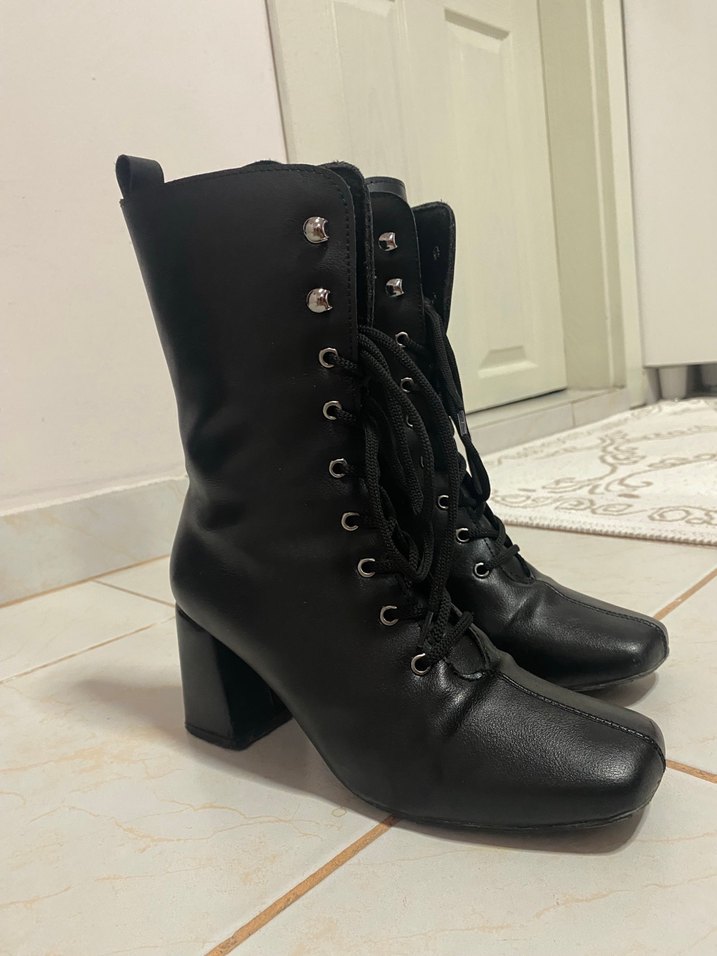 Siyah deri, bağcıklı bot sadece 2 kere giysim hiç bir sorunu yok sadece topukludan vazgeçtiğim için satıcam almak isterseniz yardımcı olurum