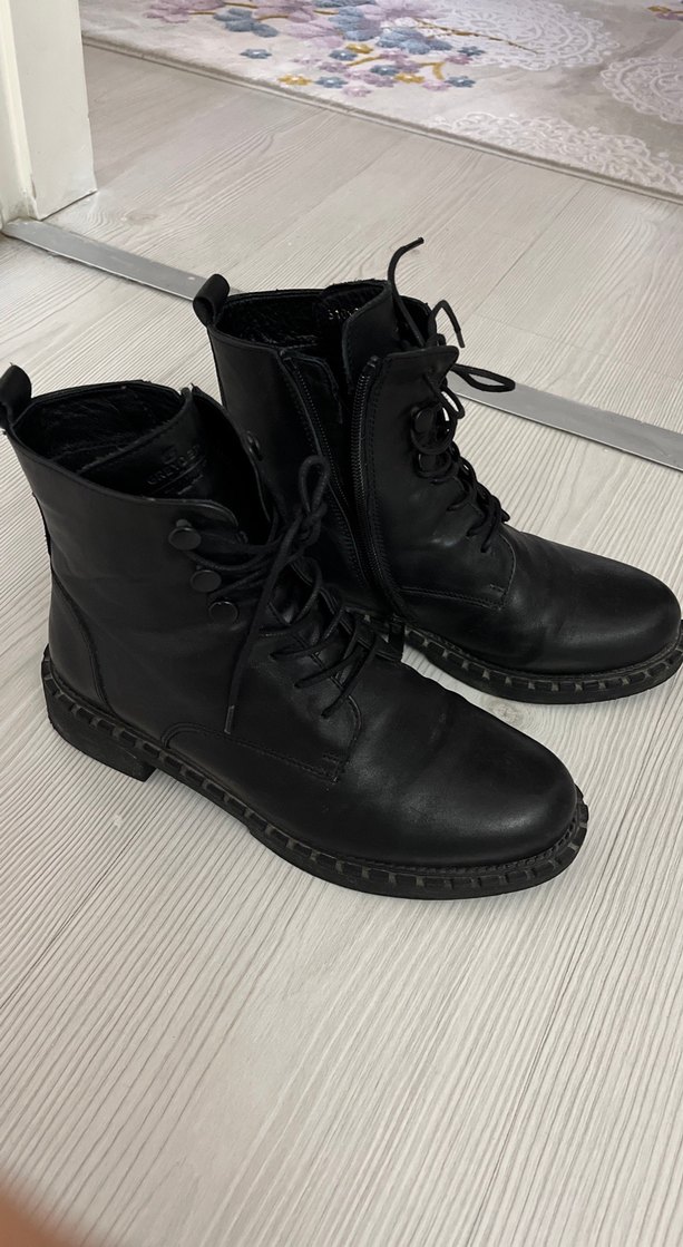 Siyah deri, bağcıklı ve kalın topuklu gotik tarzda bot. Günlük kullanıma uygun, desensiz ve koyu renkli.