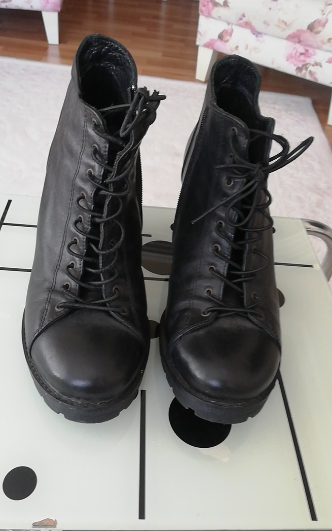 Siyah deri, bağcıklı ve tokalı kadın goth botları, dolgu topuklu ve gündelik kullanım için uygun. Rock punk havası taşır.