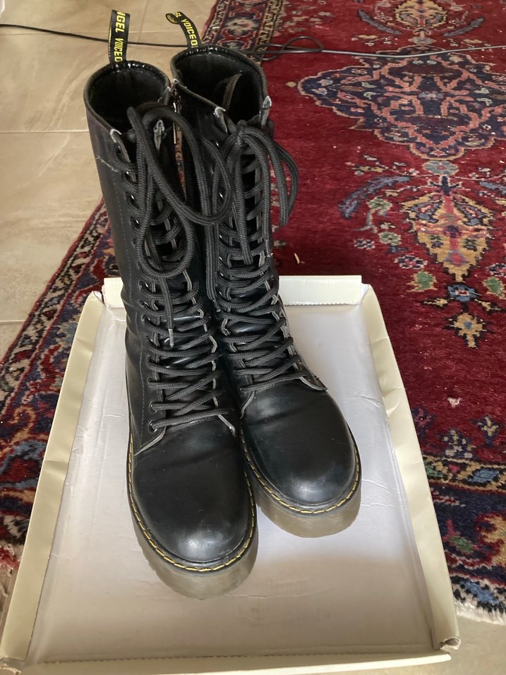 Siyah deri, bağcıklı ve fermuarlı çizme. Günlük kullanıma uygun goth punk tarzını yansıtıyor.