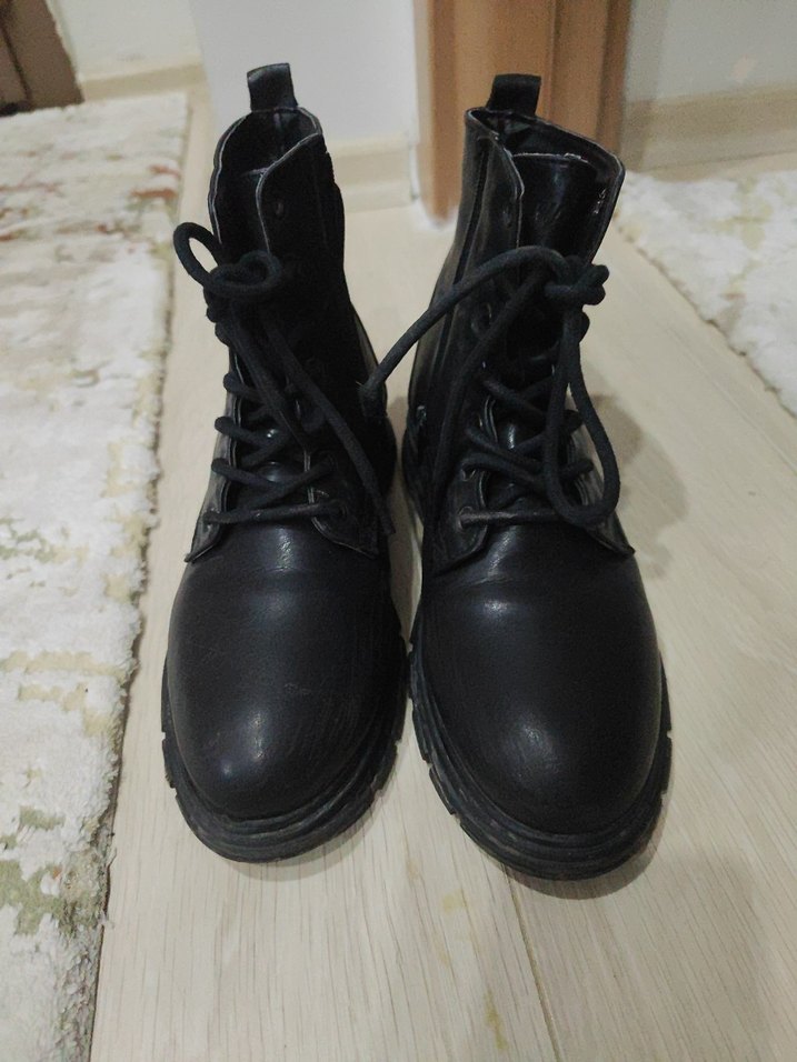 Siyah deri kadın botları, stiletto topuk ve bağcıklı tasarıma sahiptir. Günlük kullanıma uygun, koyu renk ve düz modelde rock punk havası sunar.