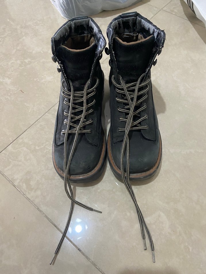 Siyah deri, stiletto topuklu, bağcıklı ve tokalı kadın botları, günlük kullanıma uygun grunge punk goth tarzında.
