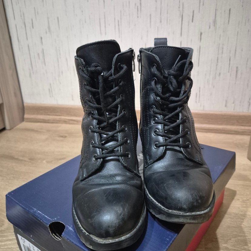 Siyah deri kadın botları, stiletto topuklu, bağcıklı ve tokalı. Grunge punk tarzında, günlük kullanım için uygun.
