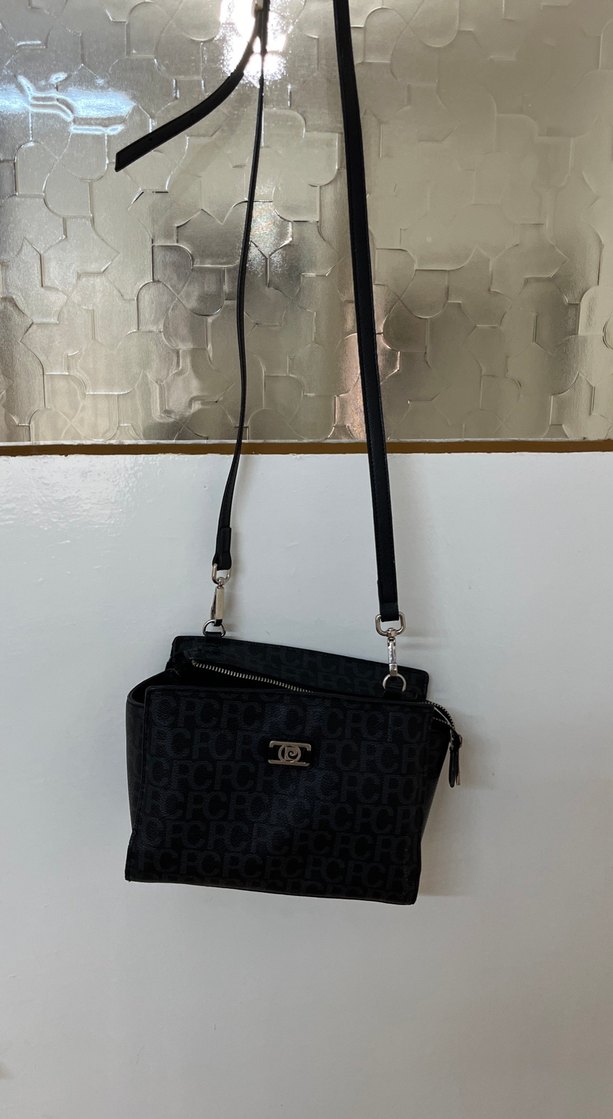 Baskılı desene sahip siyah deri kadın çanta, fermuarlı ve ince askılıdır. günlük kullanım için idealdir. İç kısmında hafif bir deformasyon vardır. Görsellere ekledim.