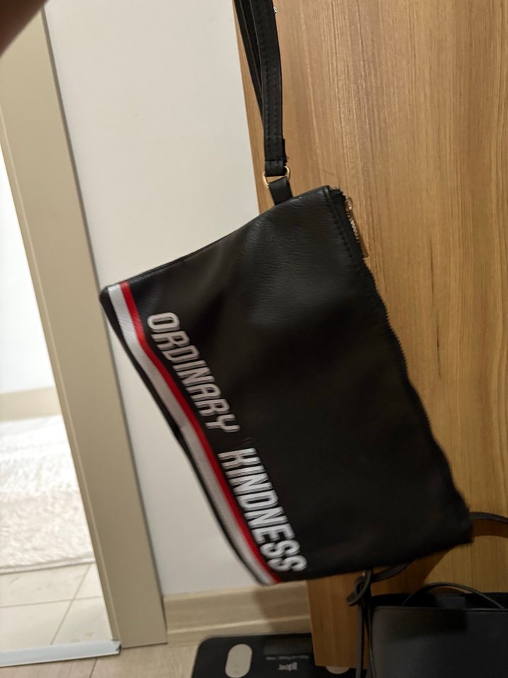 Siyah deri çapraz çanta, üzerinde "ORDINARY KINDNESS" yazılı baskı, fermuarlı kapanış ve ince askıyla günlük sokak stili ve athleisure için uygun.