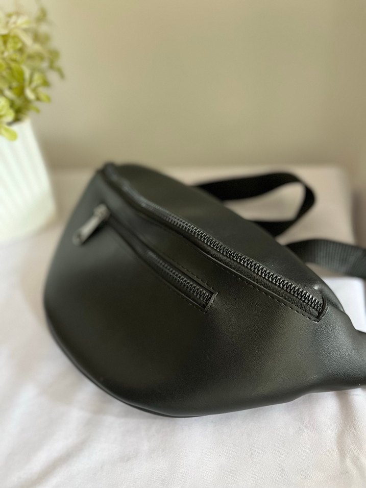 Siyah deri bel çantası, minimal tasarımlı ve günlük kullanım için uygun. Düz yüzeyli ve fermuarlı kapamalıdır.