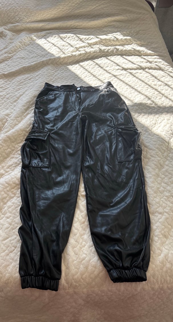 Bel detaylı, bol kesim siyah deri pantolon. Kargo cepli ve lastikli bilekler ile rahat bir kullanım sunar. 1 defa tek giyildi kilo aldığım için olmuyor