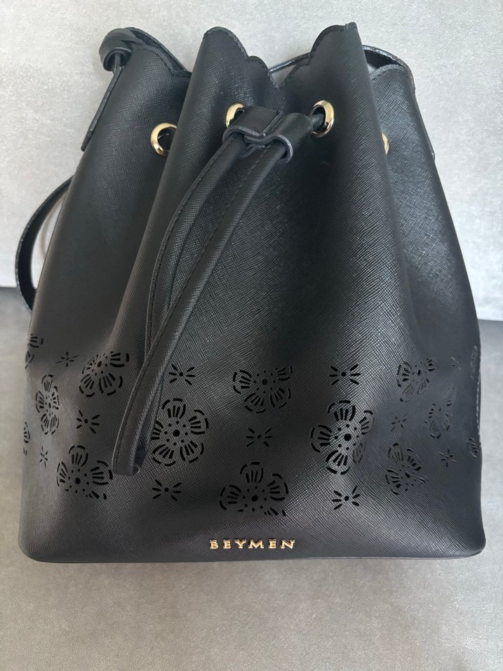 BEYMEN marka siyah deri kadın çanta, tokalı ve desenli detaylara sahip, cesur ve minimalist goth tarzı için uygun. Sap kısmında ufak bir deformasyon olup başka bir deformesi yoktur.
