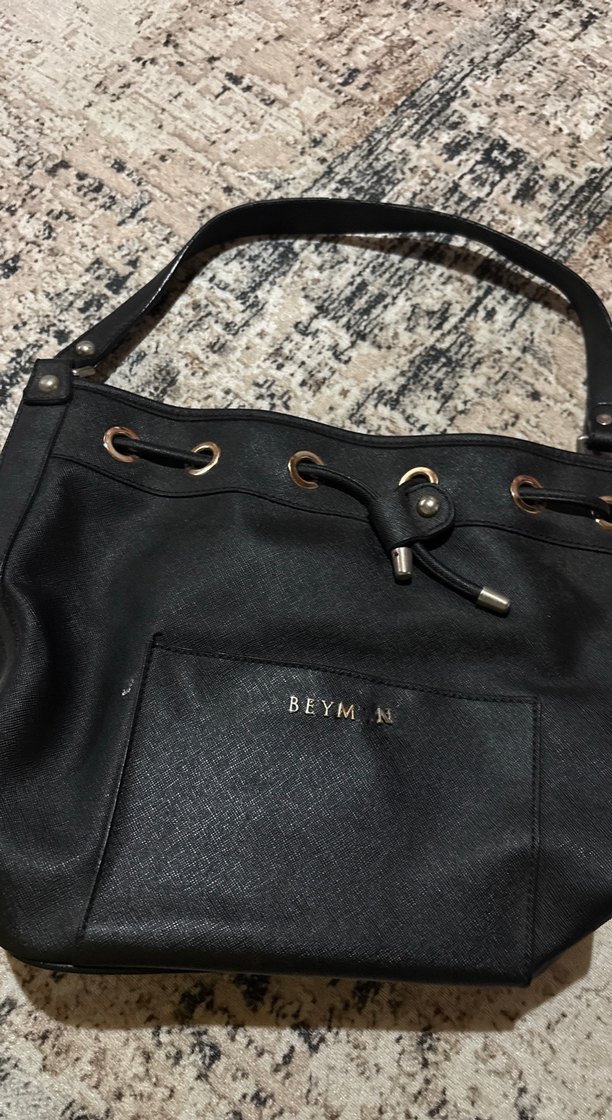 Siyah deri, baskılı dokulu ve tokalı detaylı kadın omuz çantası. Ön cepte BEYMN logosu bulunur, sokak stiline uygun. Üstünde 1 harfi düştü