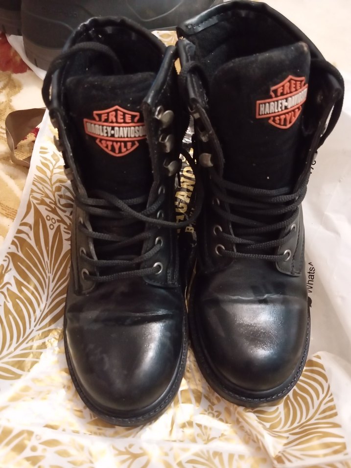 Siyah deri biker botlar, yüksek topuklu ve tokalı detaylara sahip, desenli tasarımıyla günlük kullanıma uygun. Üzerinde "FRE, SFREET, HARLEF" yazıları bulunur.