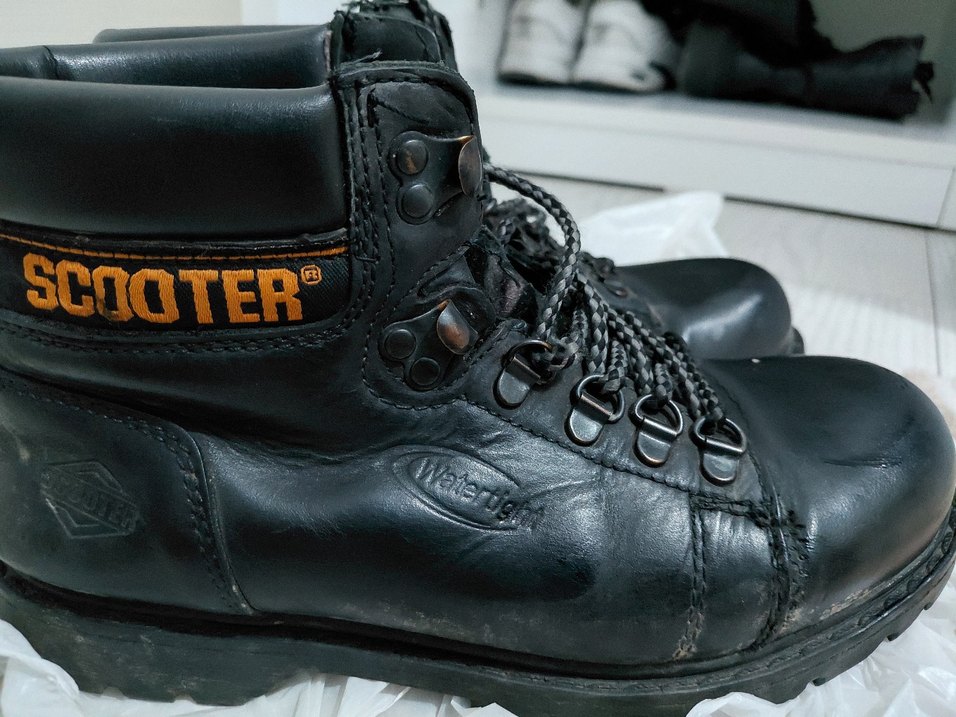 Siyah deri biker botlar tokalı detaylara sahip, günlük kullanıma uygun dayanıklı tasarım. 'WaterTuff' yazısı bulunur. Orjinal scooter marka su geçirmez
