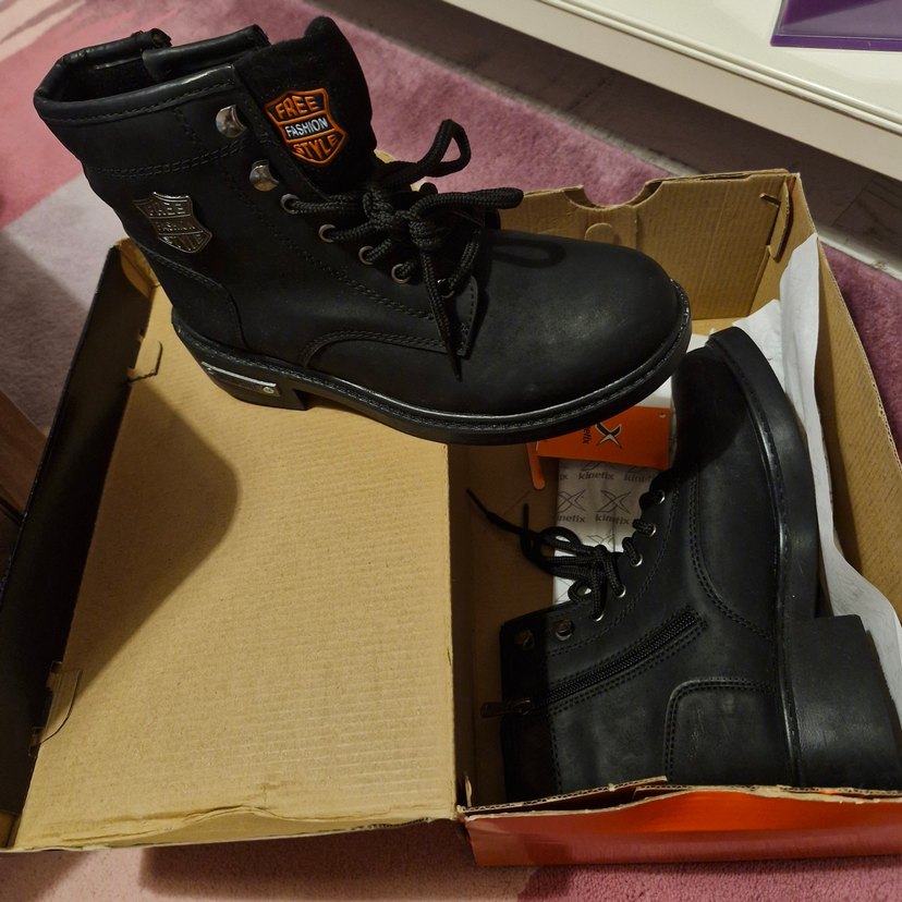 siyah deri biker botlar, tokalı ve baskılı detaylara sahip. Dayanıklı tabanlı, 'Free Fashion Style' rozeti bulunur. Günlük kullanım için grunge punk tarzında. unisex bir ayakabi sadece 1 saat kullanıldı benim ayak numaram 37 çoraplarla giyerim diye 38 aldim ama büyük geldi yeniden farksız dediğim gibi zaten 1 saat kadar kullanıldı