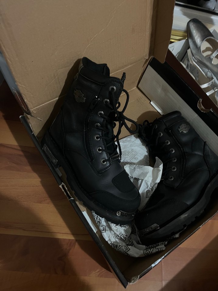 Siyah deri, tokalı biker botları,sağlam tasarım.