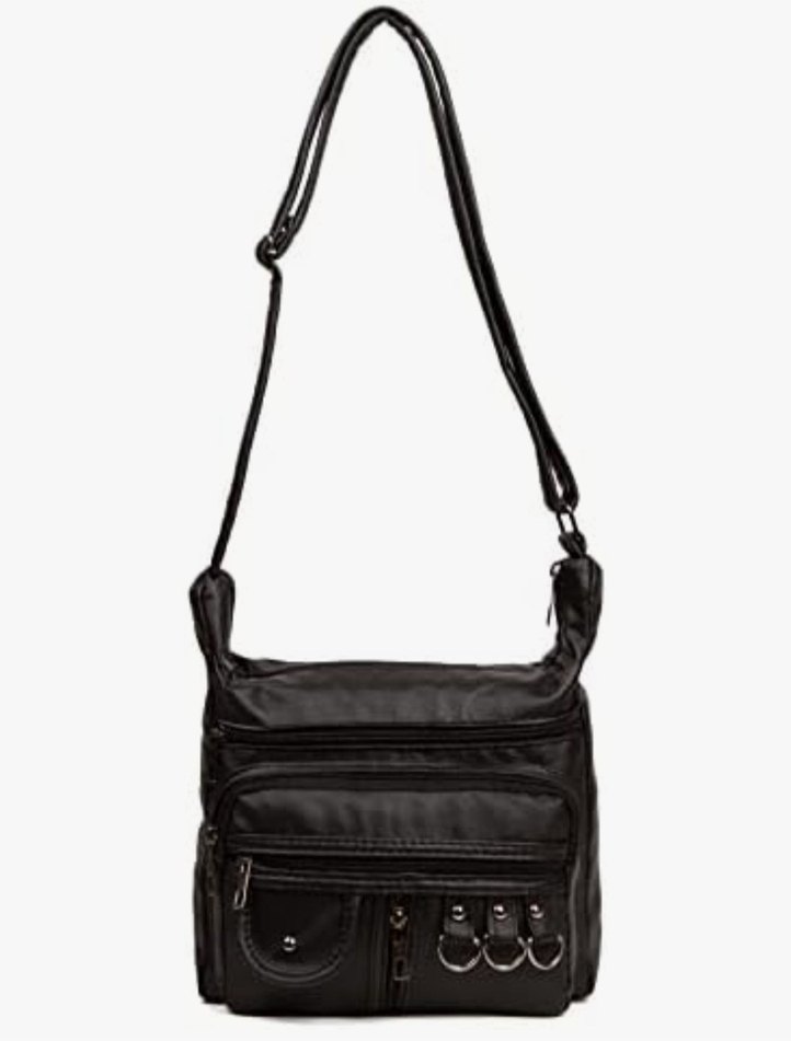 Siyah deri biker çanta, çoklu fermuarlı bölmeler ve tokalı detaylarla minimalist ve şık bir görünüm sunar.