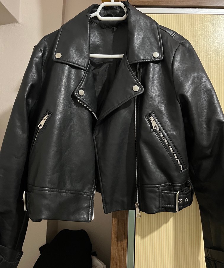 Siyah deri biker ceket, oturtmalı kesim ve kesik yaka detayına sahip. Tokalı ve fermuarlı cepler bulunur, günlük kullanıma uygun.