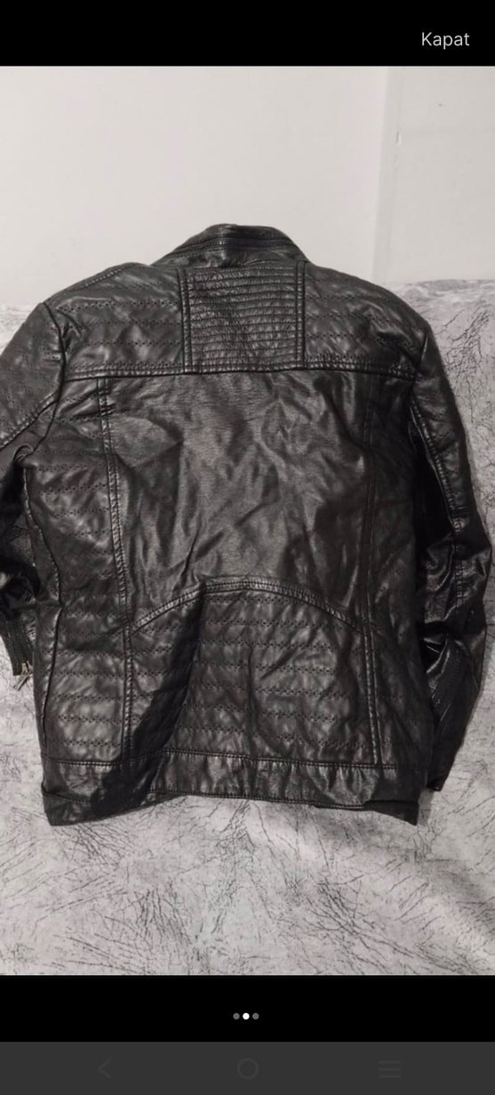 Siyah deri biker ceket, fermuarlı ve kesik yakalıdır. Vücuda oturan kesimi, uzun kolları ve normal midi boyu ile günlük ve sokak stiline uygundur. ve biraz yaka kisminda soyulma mevcut