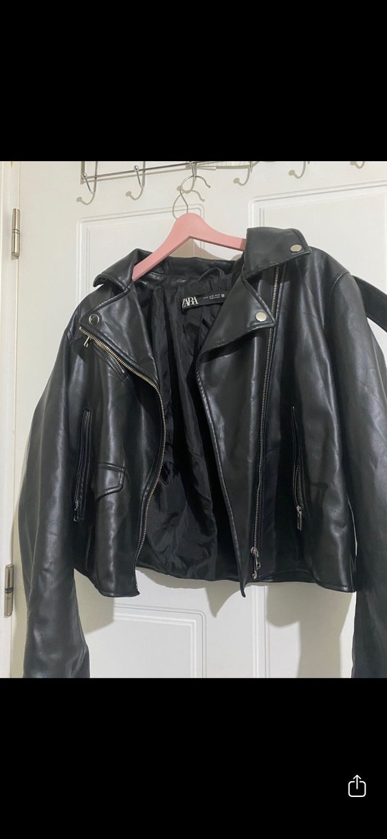 Siyah, fitted deri biker ceket, çıtçıtlı yaka ve fermuarlı detaylara sahip, trend günlük tarz için uygundur.